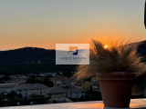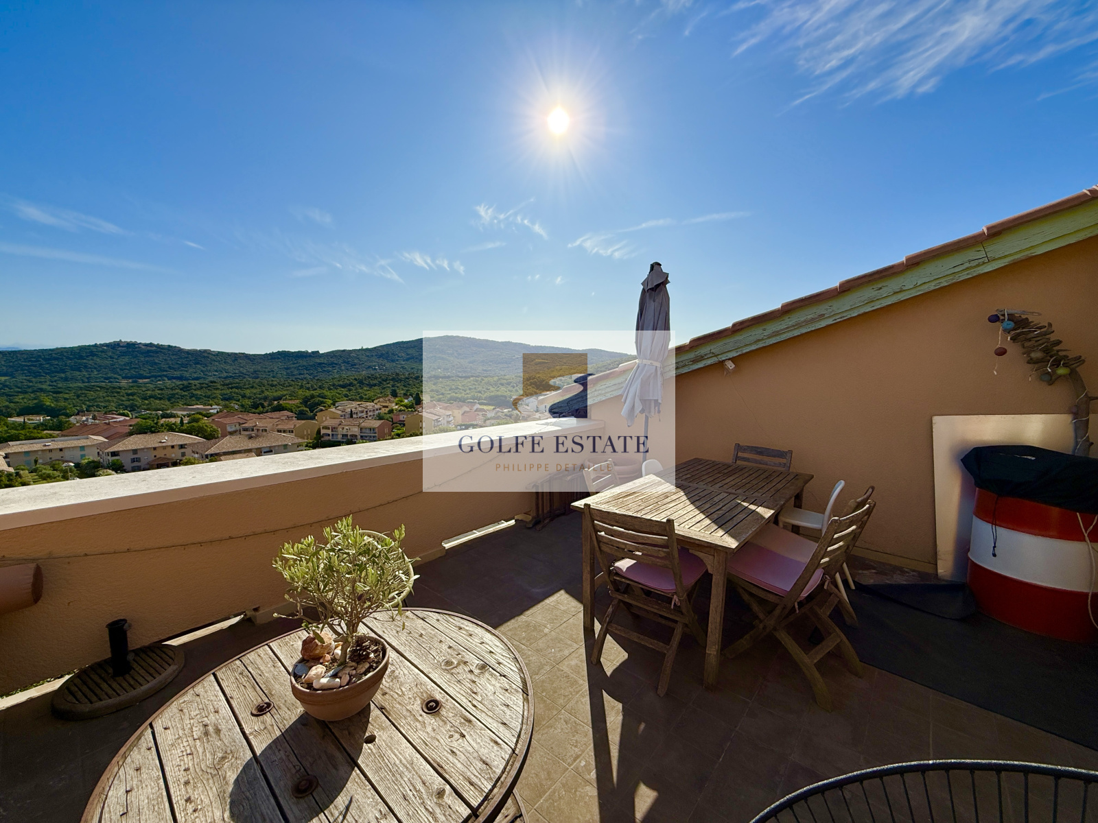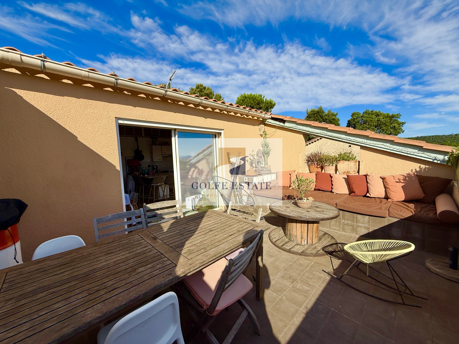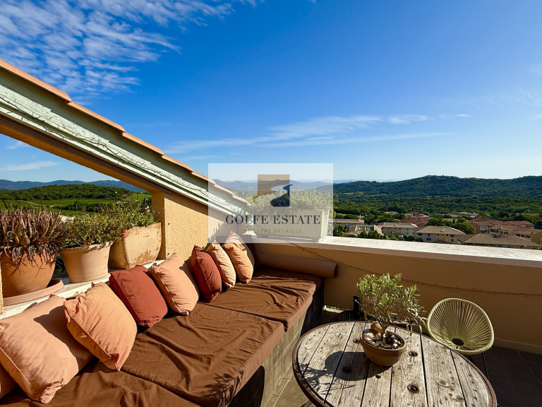 L’espace de vie propose un séjour lumineux (Toit cathédrale mansardé) avec cuisine ouverte le tout donnant sur une grande terrasse tropezienne offrant une vue imprenable sur le Golfe de Saint-Tropez, le village de Gassin, les vignes du Château de Chausse et les Alpes enneigés en Hiver.