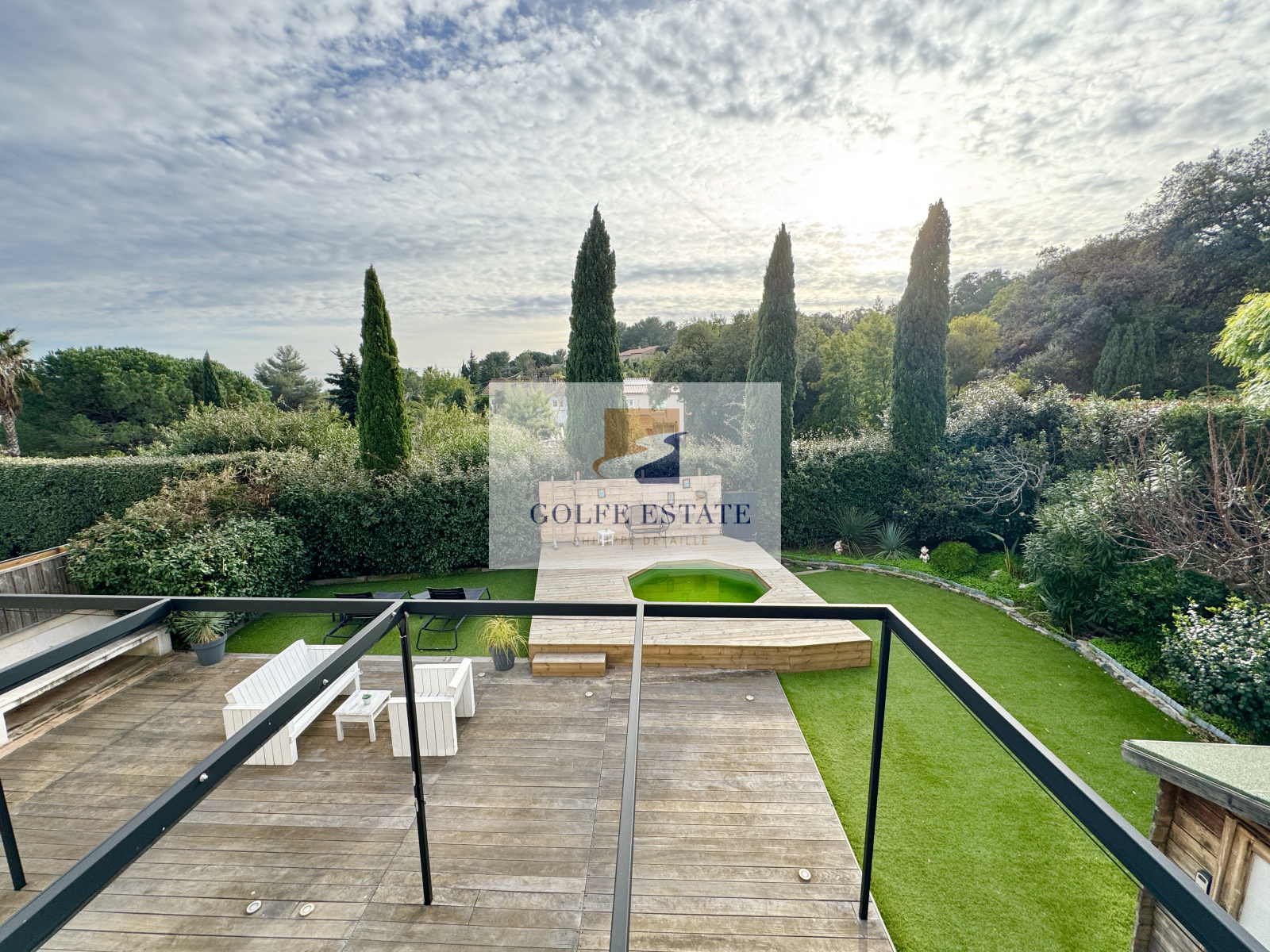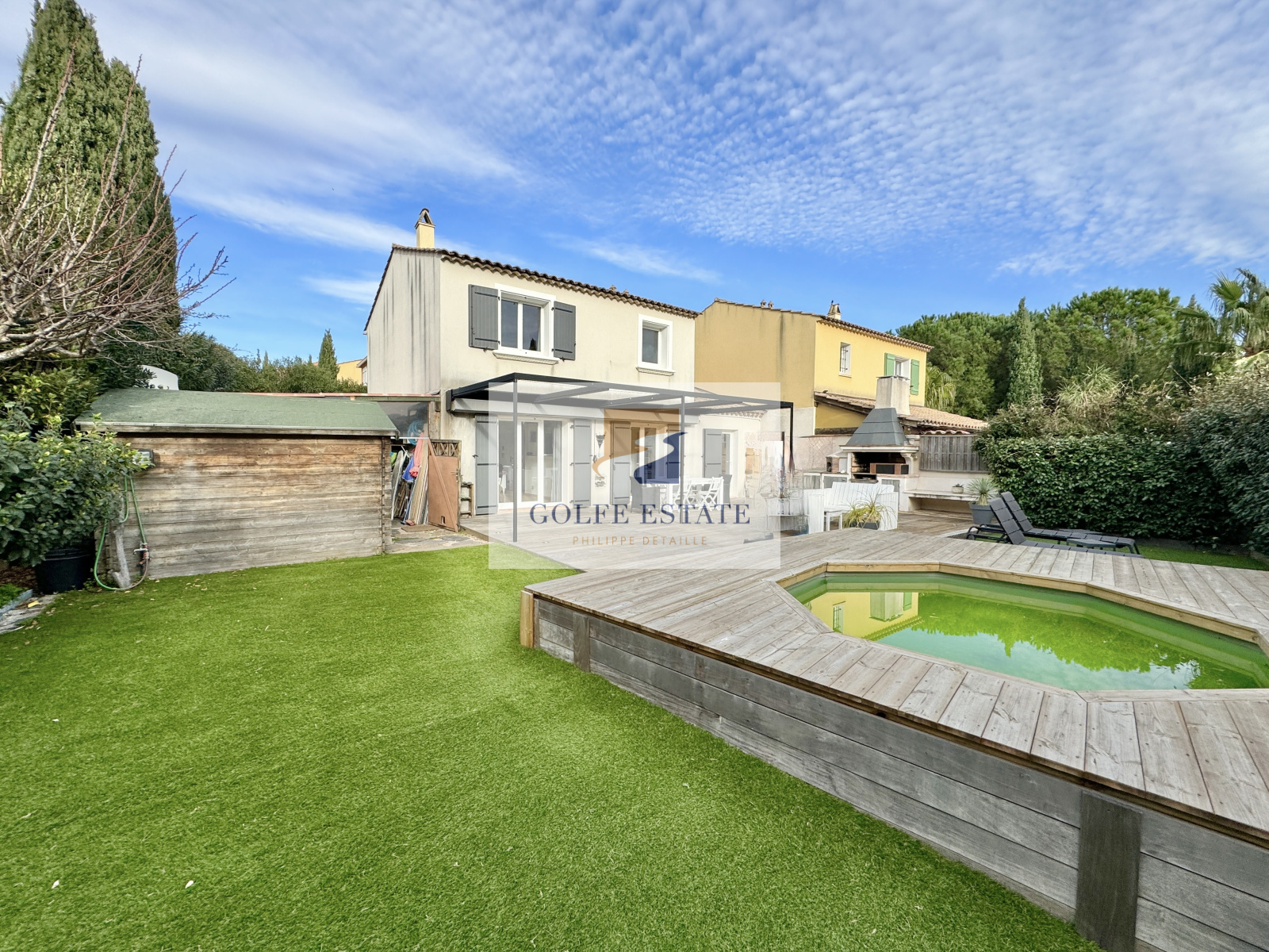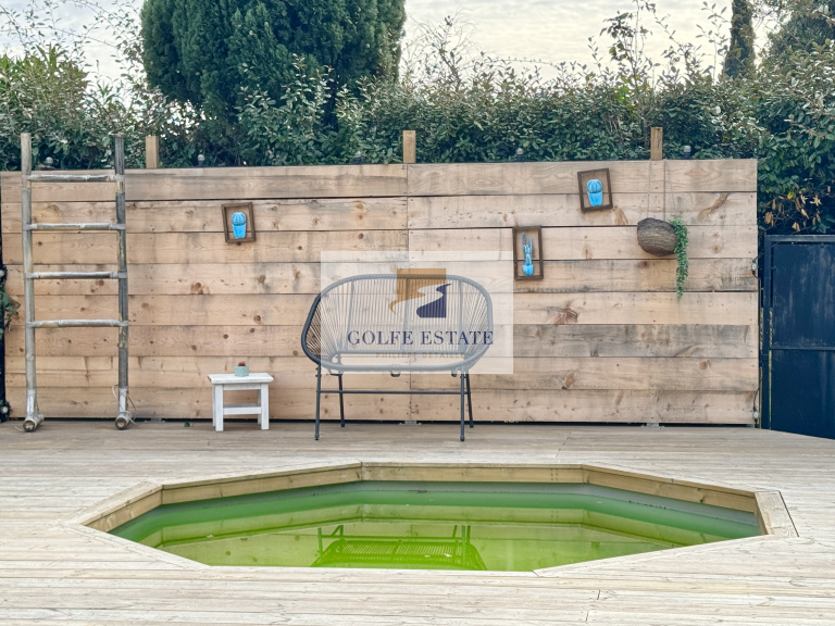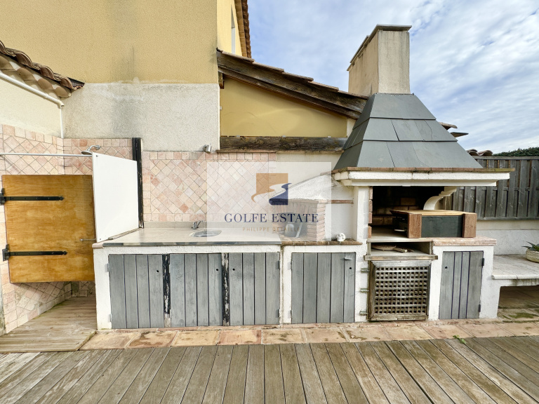 Jolie espace extérieur avec piscine hors-sol, plage en bois, cuisine extérieur et barbecue.