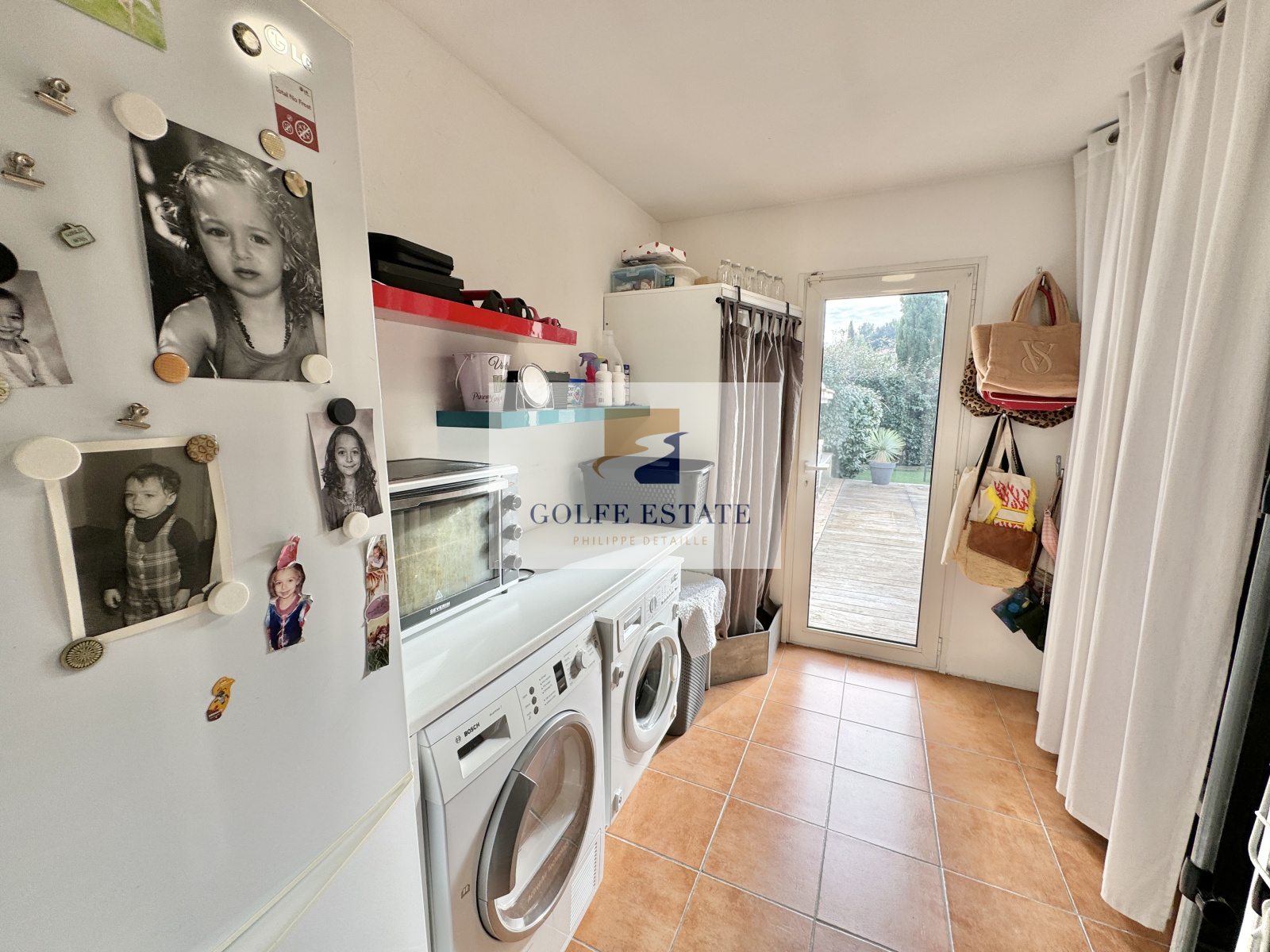 Composée en rez de jardin d'une grande pièce de vie séjour / salle à manger / cuisine ouverte, un wc invités, une buanderie, une chambre / bureau.