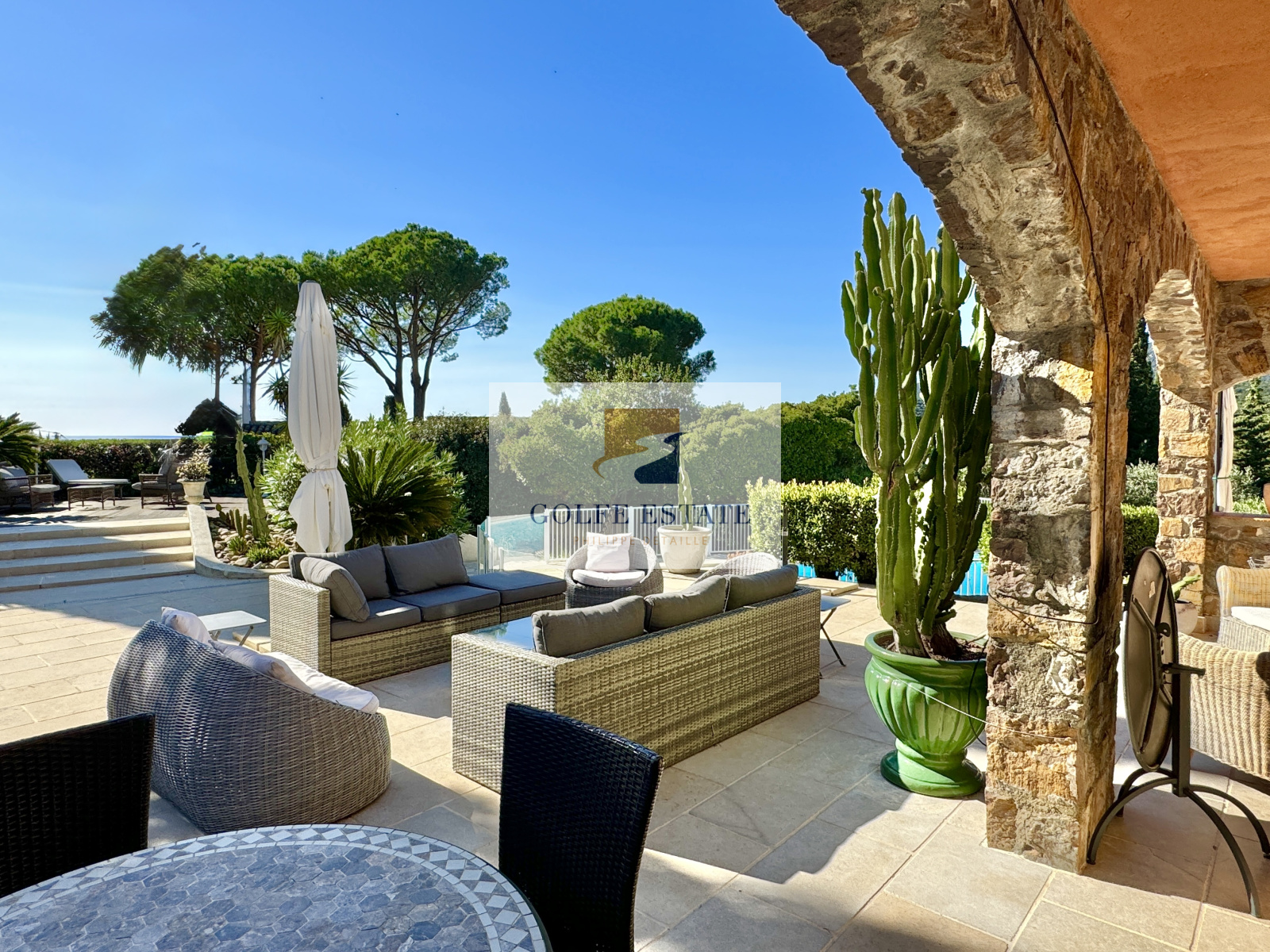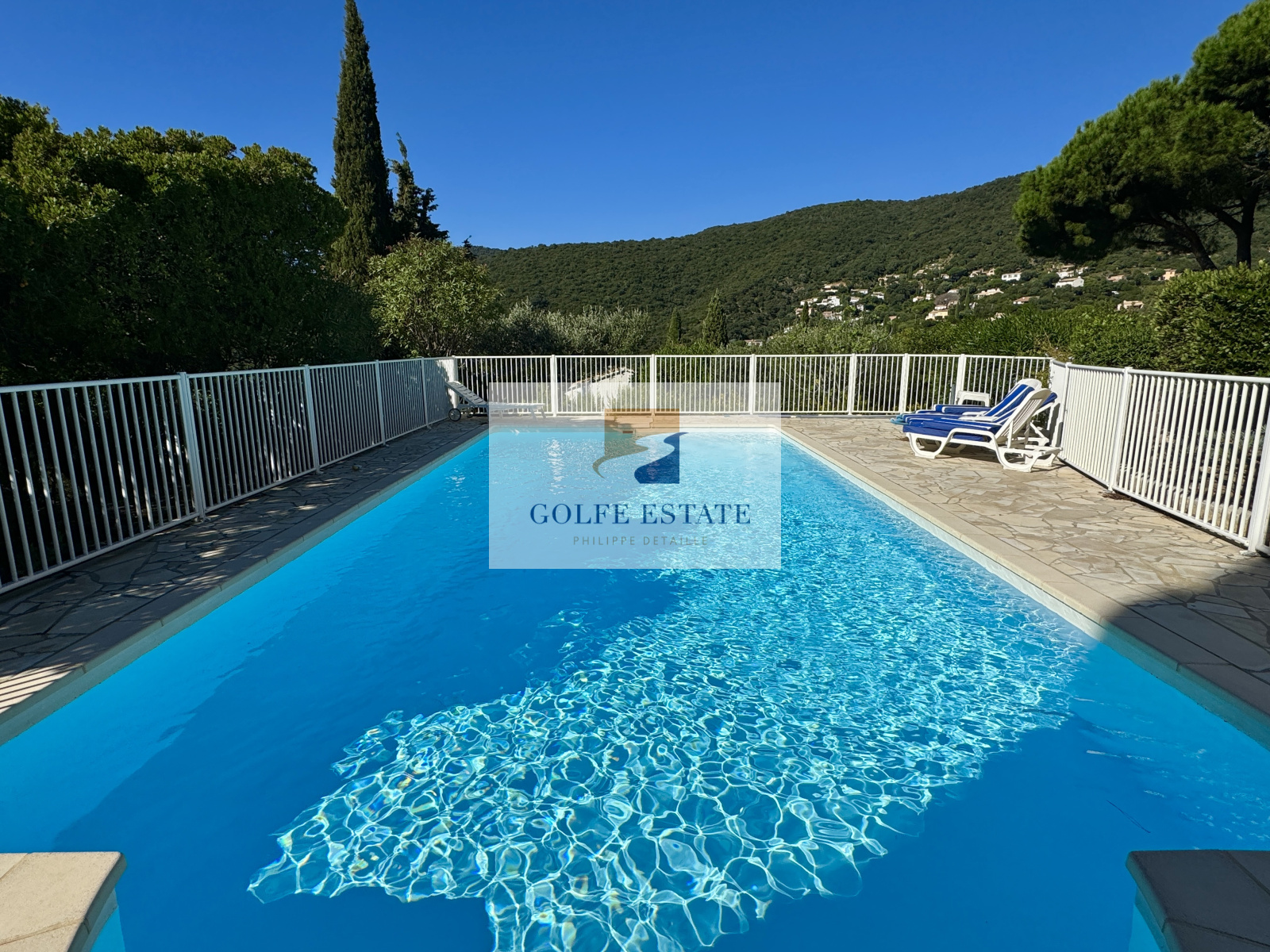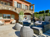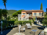 Dans le jardin paysagé, on trouve une piscine de 11 x 5 m de nombreuses terrasses carrelées ou en bois, un terrain de pétanque et un bel espace parking voiture côté garage.