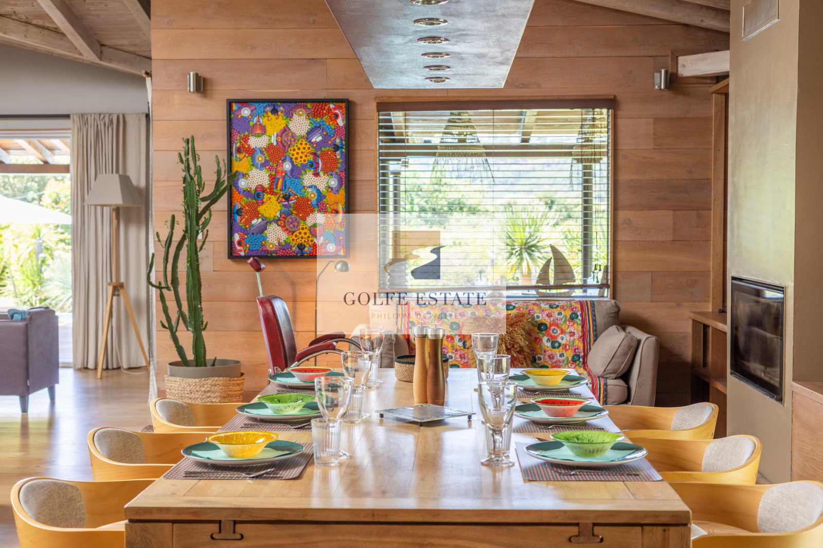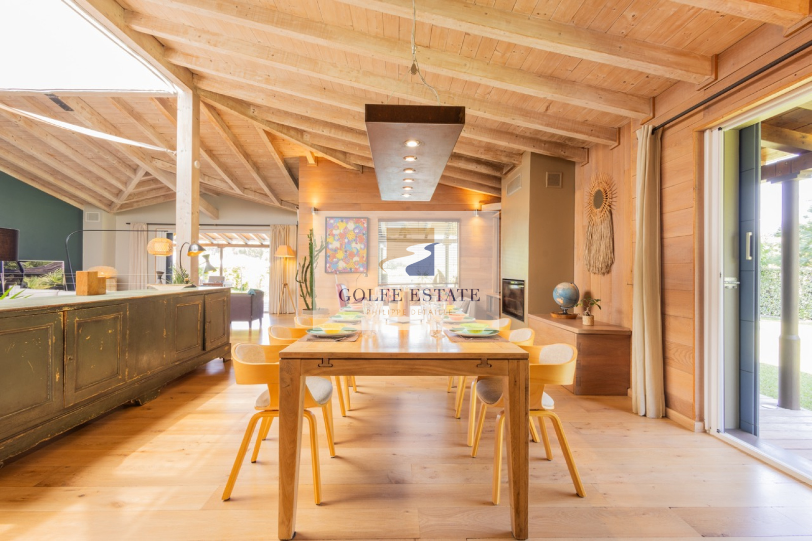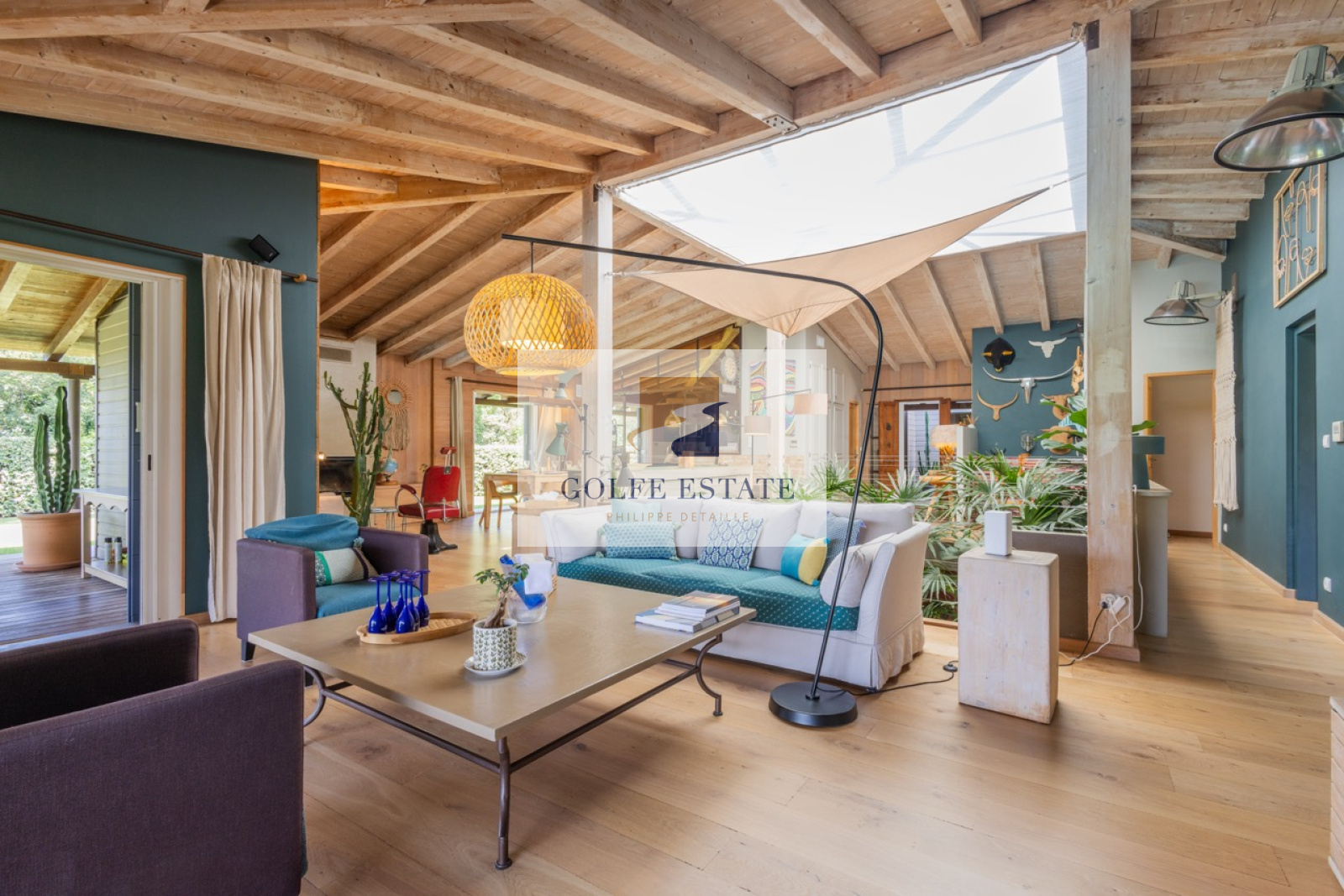 La villa s’ouvre sur une entrée menant à un vaste séjour baigné de lumière, prolongé par une cuisine semi-ouverte entièrement équipée, avec un accès direct à la terrasse.