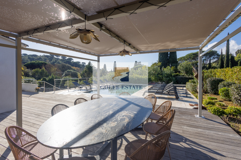 Superbe terrasse ombragée avec cuisine extérieure et piscine chauffée.