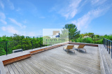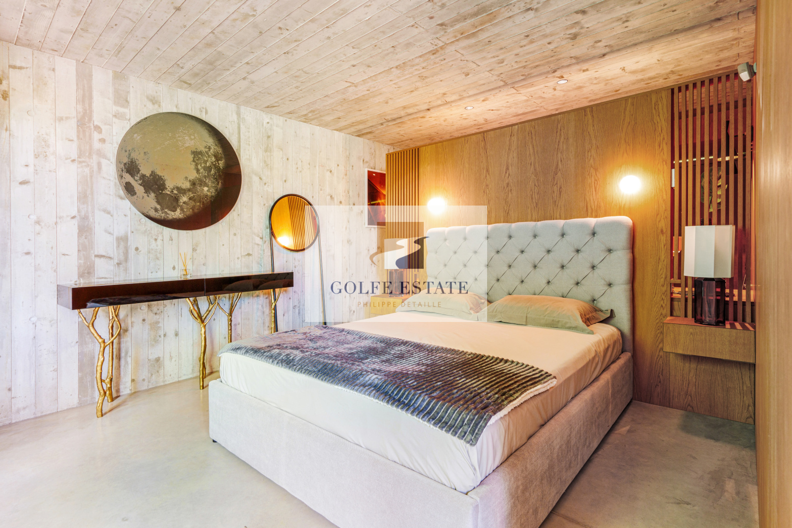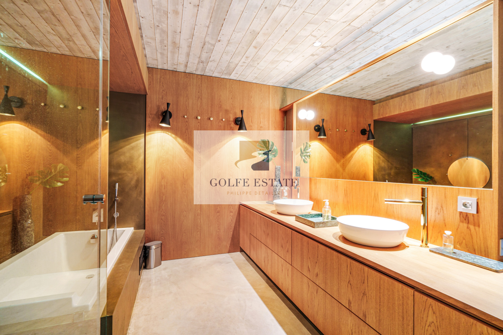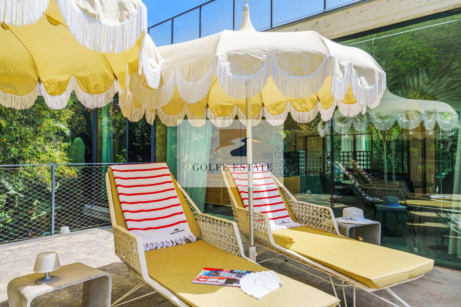 Répartie sur deux niveaux, elle présente des caractéristiques uniques et raffinées. Au rez-de-chaussée, une magnifique terrasse ombragée s'ouvre sur une cuisine entièrement équipée, deux chambres en suite, une buanderie et des toilettes invités. À l'étage supérieur, un vaste séjour lumineux mène à la chambre principale avec sa salle de bains attenante, tout en offrant un accès aux quatre terrasses de la propriété, dont le toit-terrasse, ainsi qu'à la piscine à débordement chauffée.