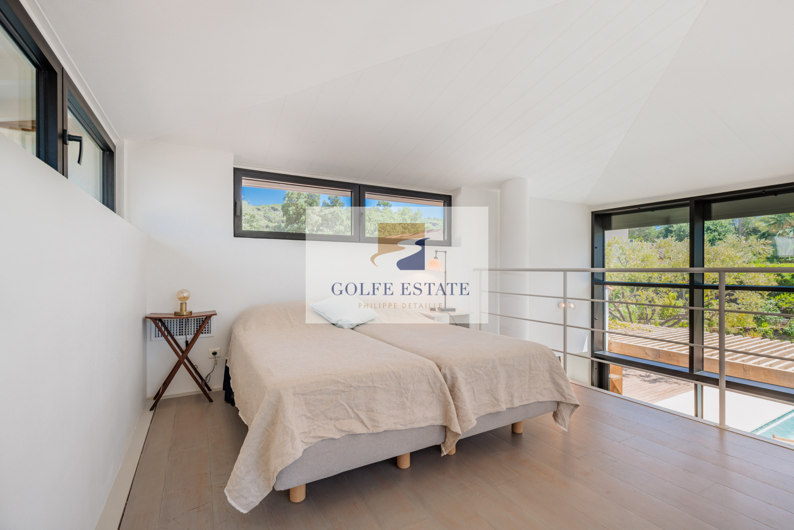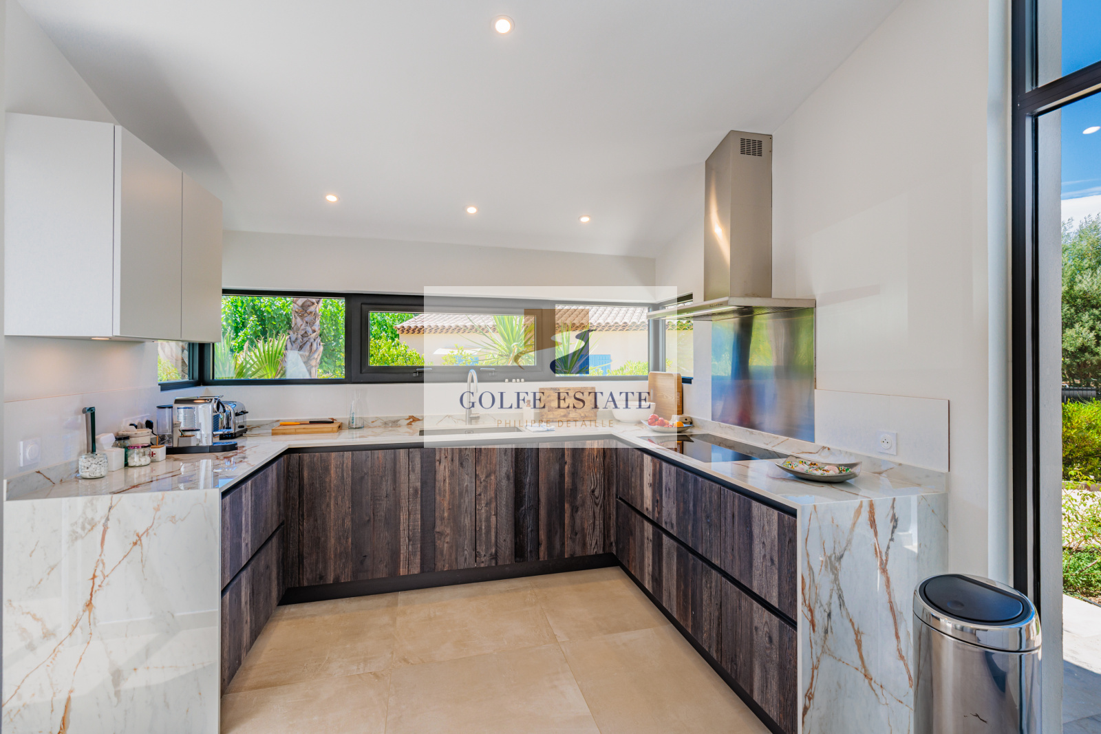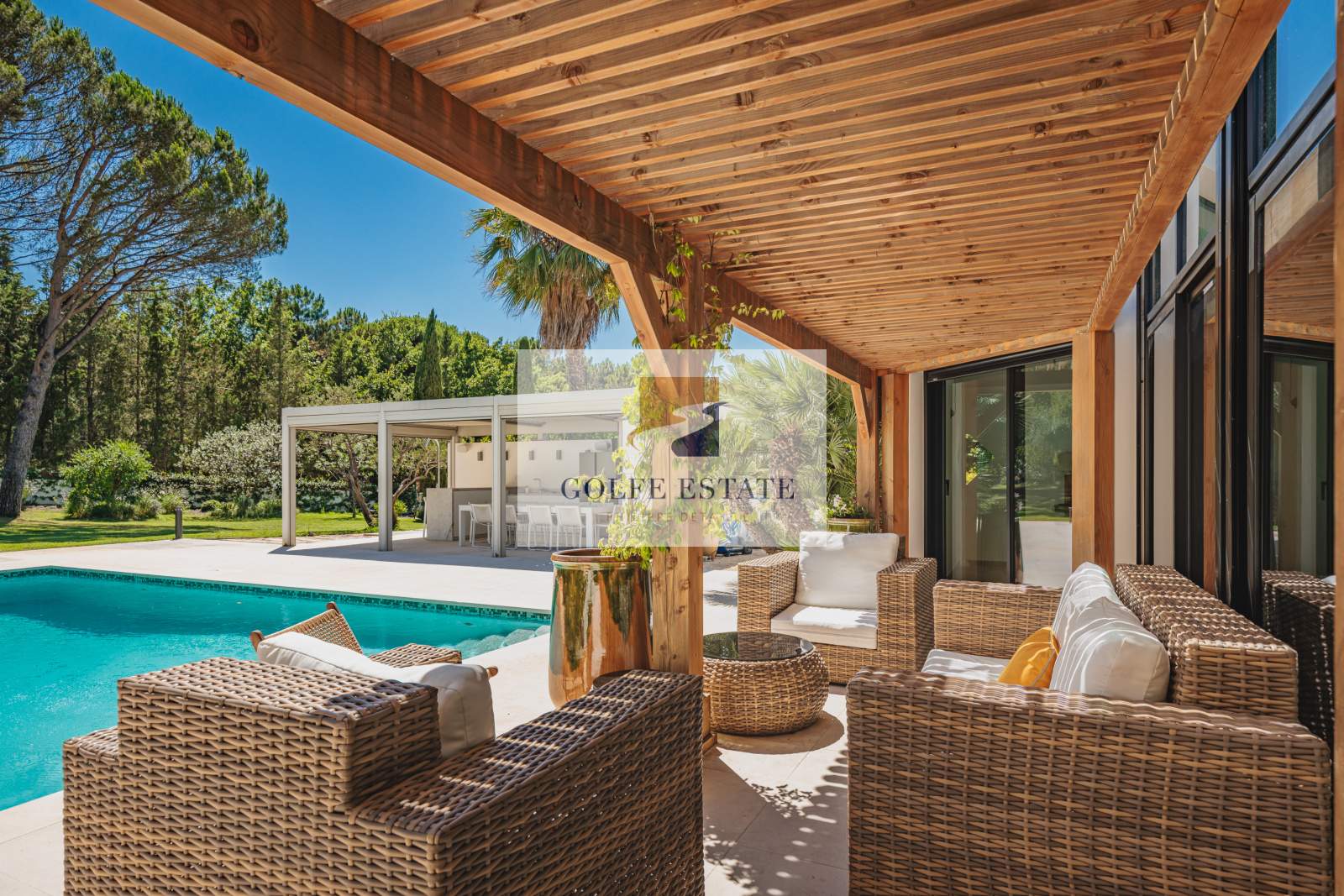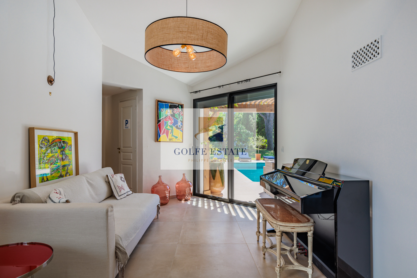 La villa est équipée de la climatisation réversible et de larges ouvertures à galandage dans toutes les pièces, offrant une belle continuité entre intérieur et extérieur.