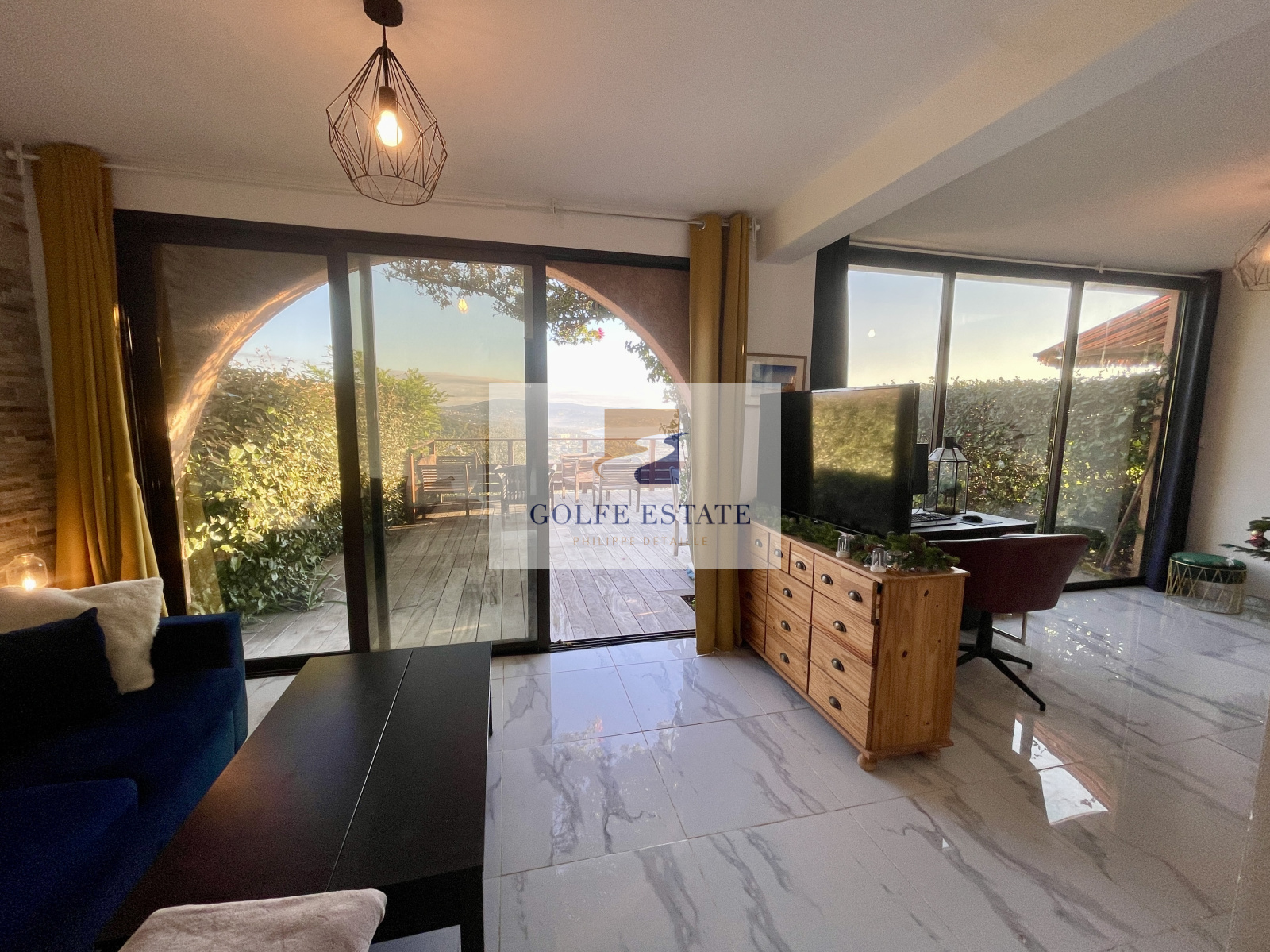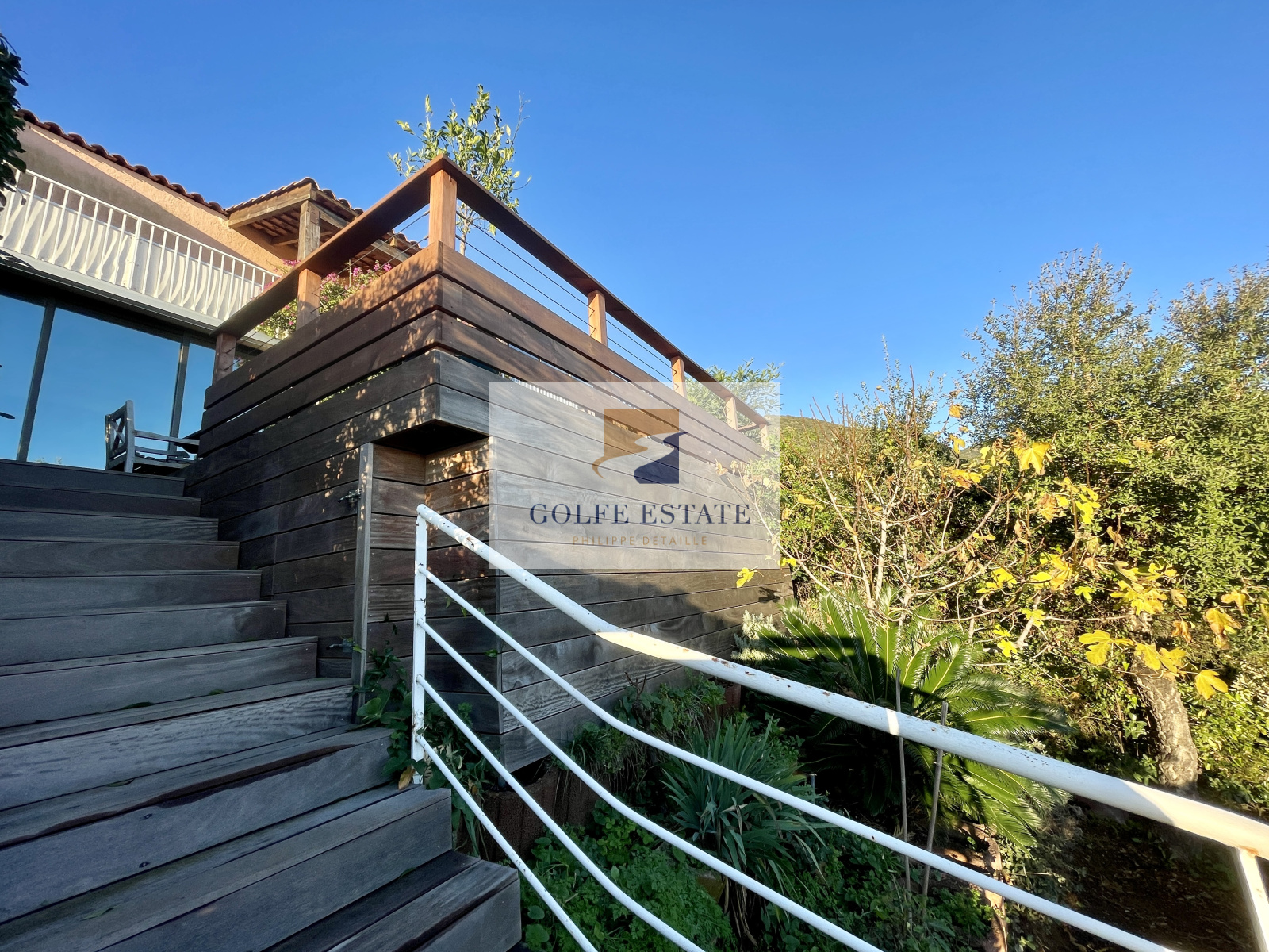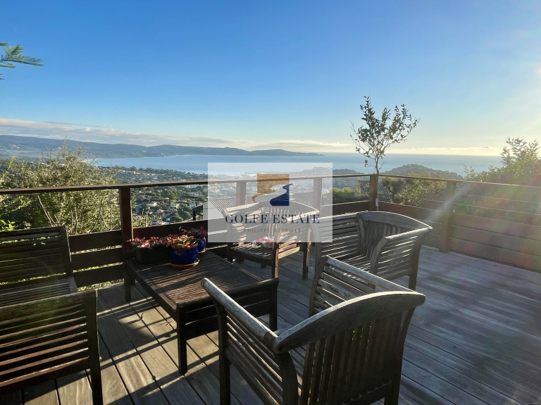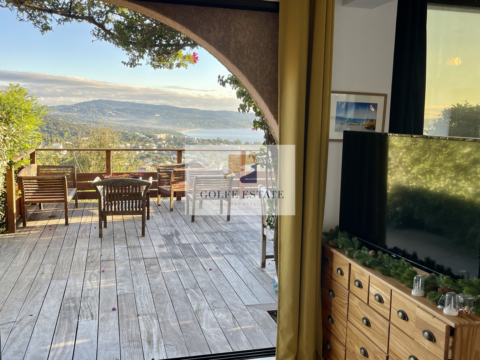 A Cavalaire, vue panoramique mer exceptionnelle sur toute la baie et le Cap Lardier pour ce T2 de charme de 47 m2 habitable, dont 27,36 m2 en loi Carrez en rez-de jardin. Il profite d'une grande terrasse bois de 35 m2 de plain pied et un coin jardin idéal pour un potager.
