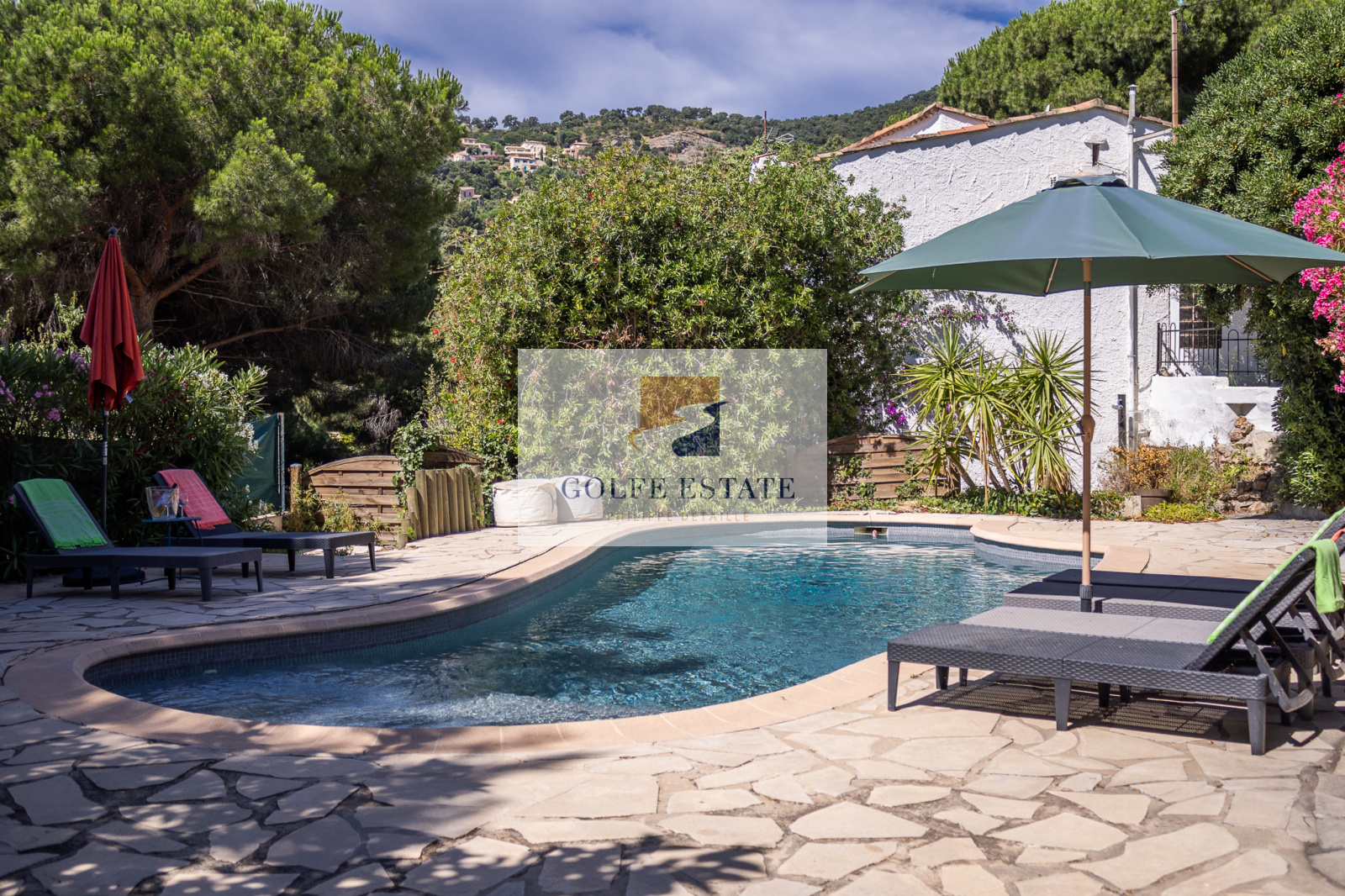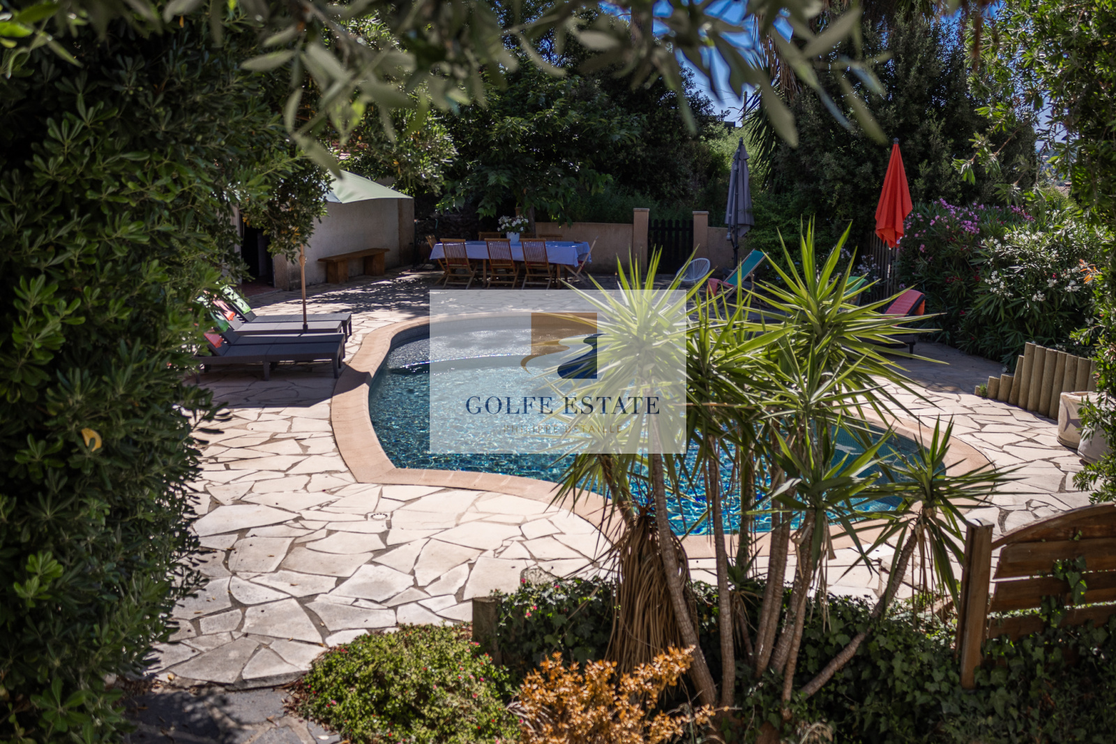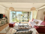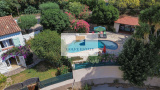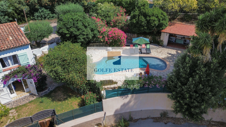 VENDUE - Dans un joli quartier résidentiel, cette maison sur deux niveaux avec piscine bénéficie d'une vue mer de la pièce principale.