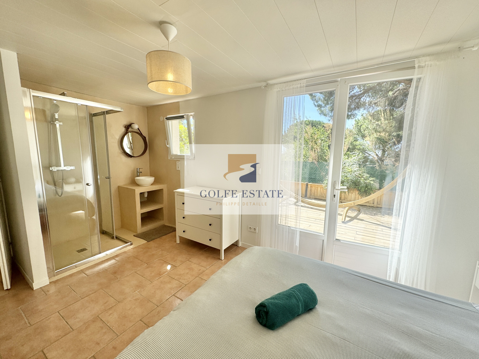Au niveau inférieur en rez de jardin, 2 chambres attenantes avec salle de douche, 1 chambre, 1 salle de douche, 1 wc, 1 buanderie. Pièce indépendante pouvant être une chambre supplémentaire ou espace de stockage.
