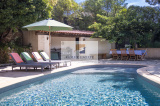 Piscine traditionnelle de forme libre avec plage autour et cuisine d'extérieur équipée.