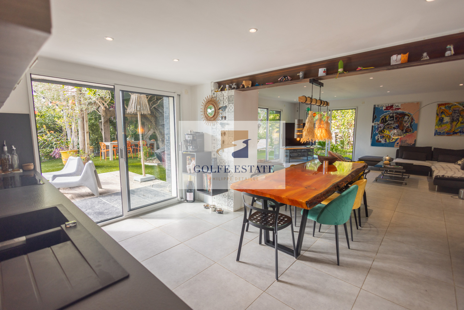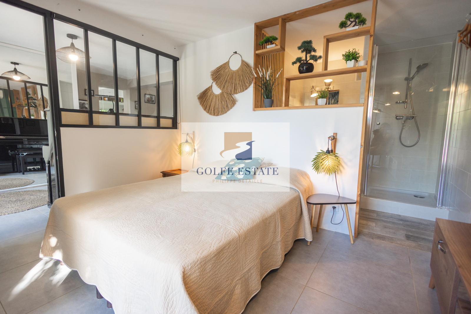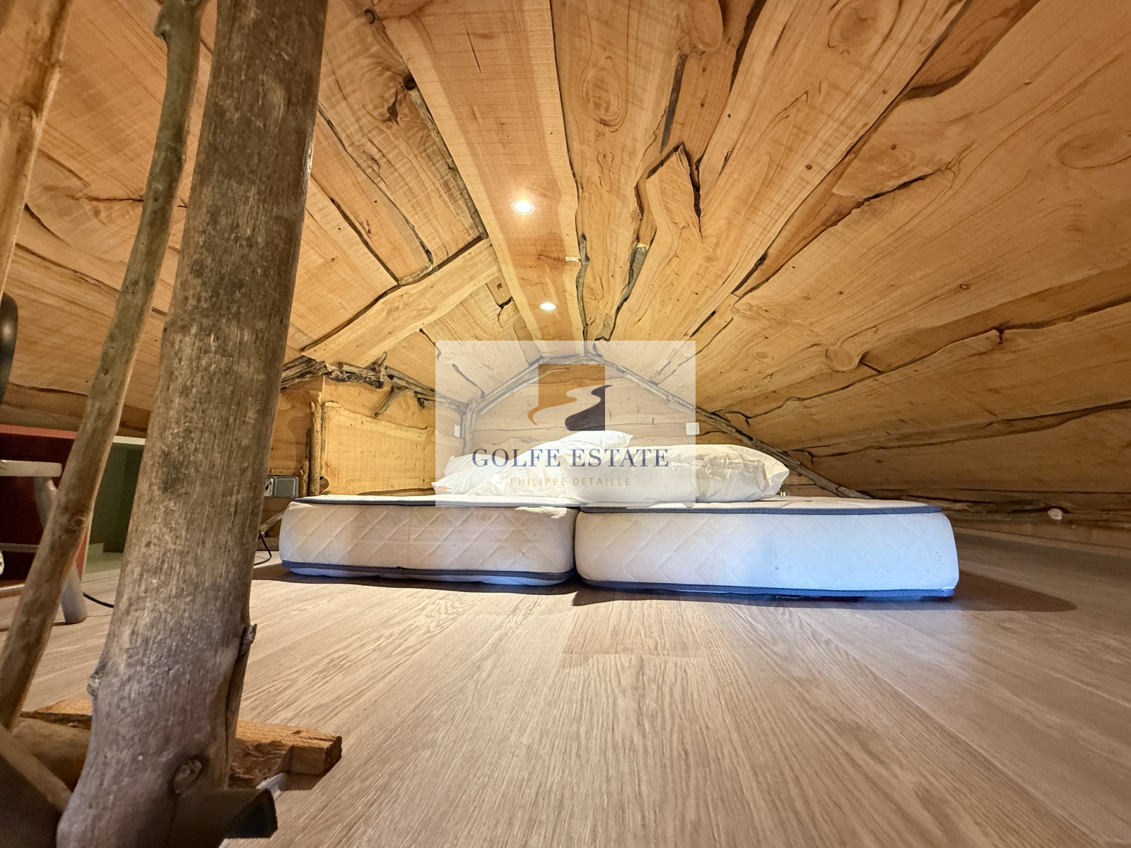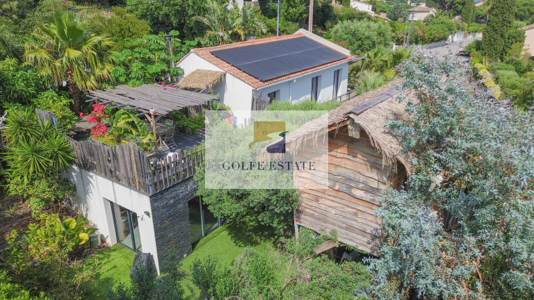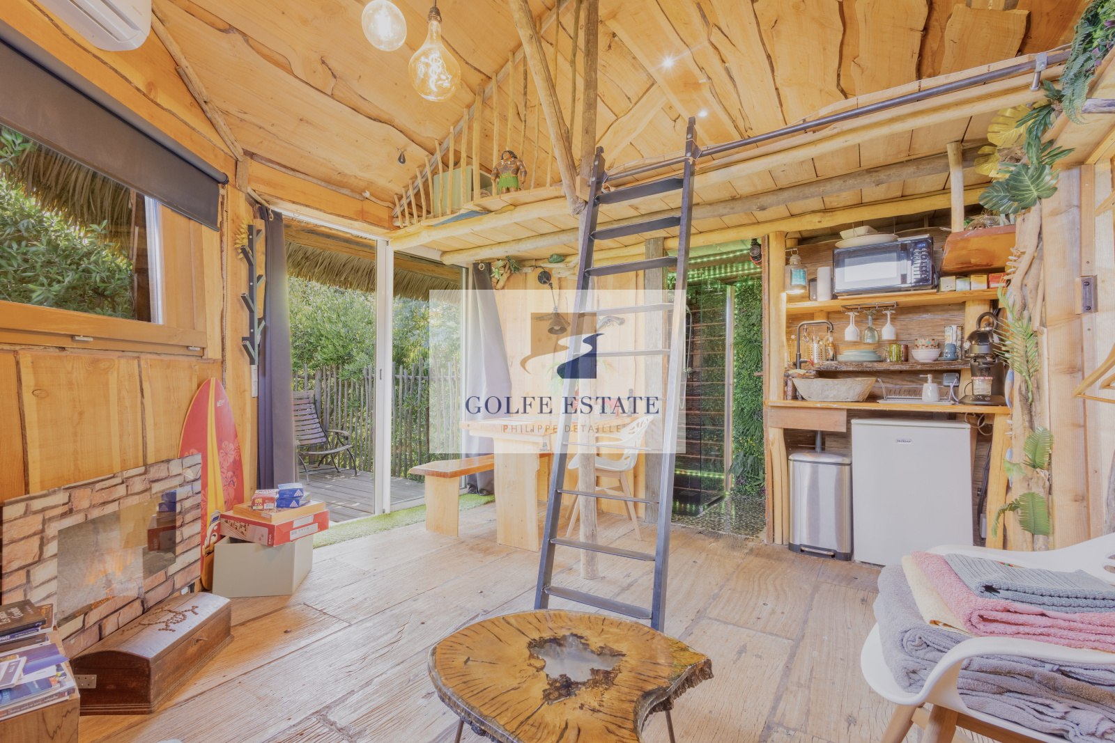 La maison principale de 4 chambres d'environ 140 m2, au confort d'une habitation à l'année est entourée d'un jardin luxuriant au parfum exotique et d'un cabanon perché d'environ 20 m2, isolée et climatisée.