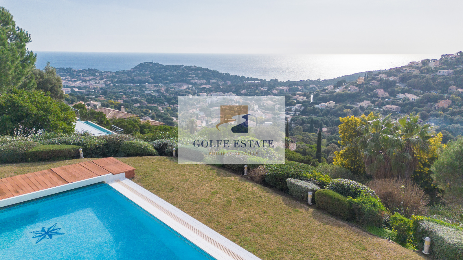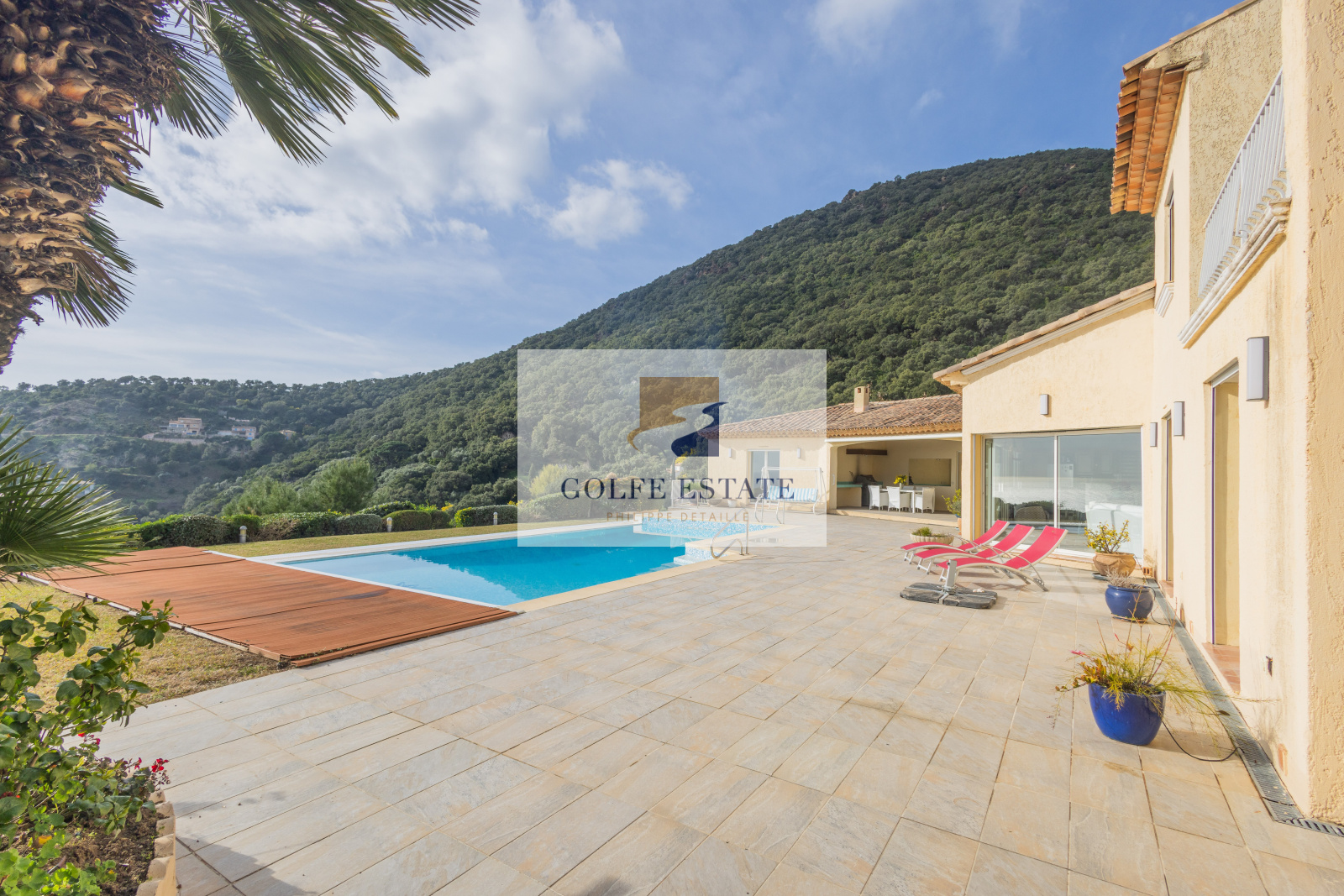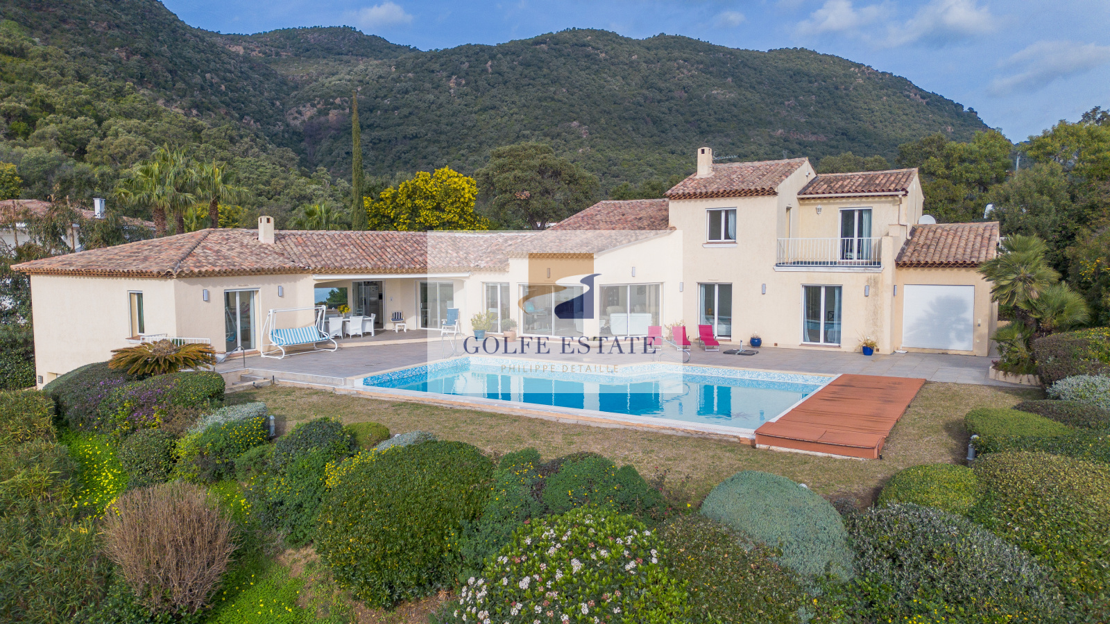 Située dans un quartier résidentiel au calme absolu, en bordure d'espace boisé classé, cette spacieuse villa de 350 m², édifiée sur un très beau terrain paysagé de plus de 2 000 m2 bénéficie d'une vue mer panoramique sur la baie de Cavalaire et les collines des Pradels.